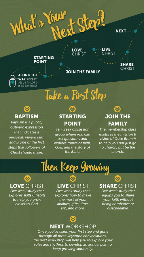 NOT SURE WHAT'S NEXT IN YOUR SPIRITUAL GROWTH? Sign up for one of the steps listed below to help you connect with others and go deeper spiritually.